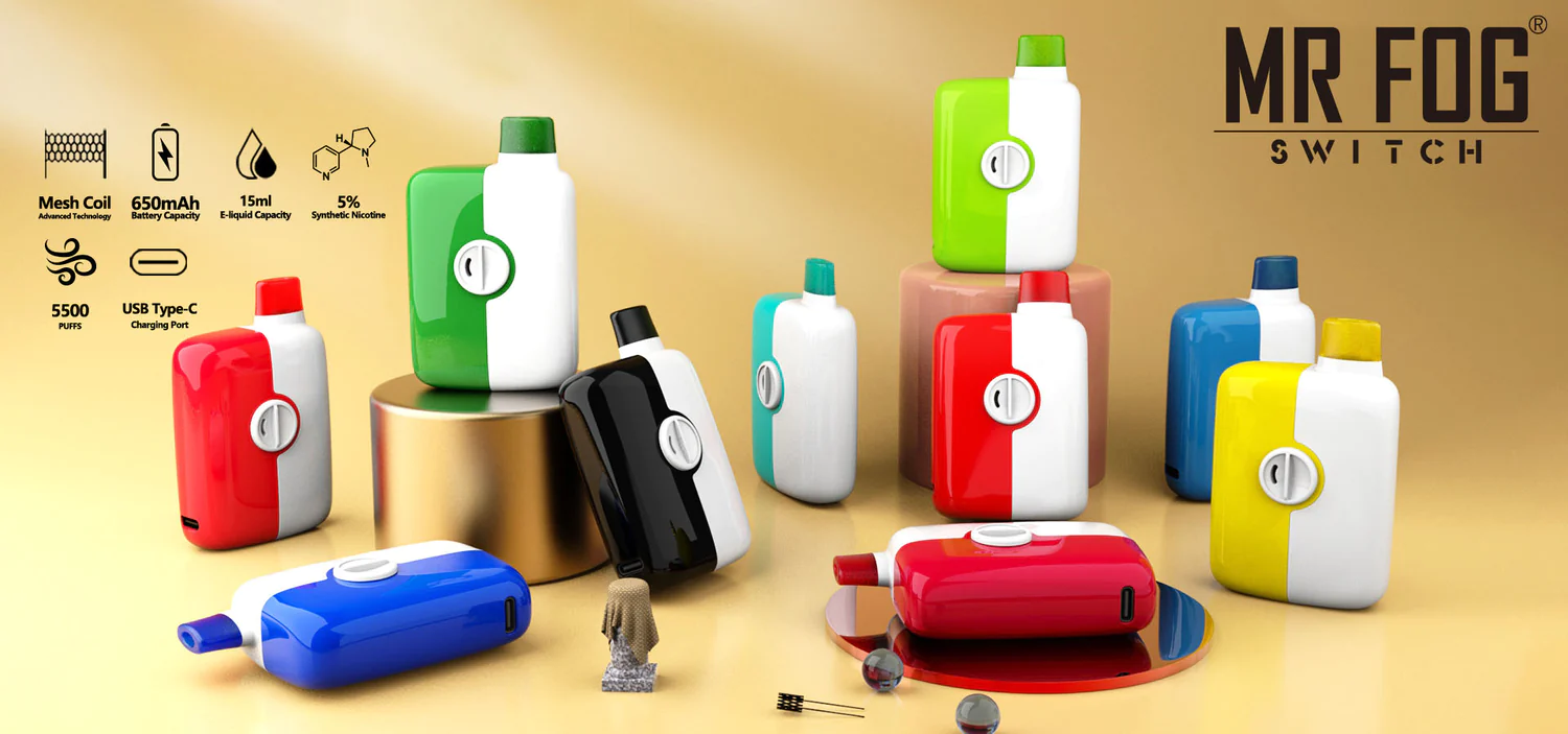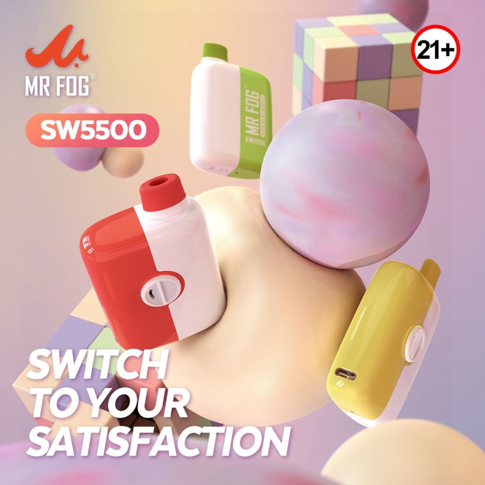 Introducing Mr. Fog's newest disposable The Switch! This new 5500 puff disposable features a mesh coil for amazing flavour, an innovative adjustable airflow control dial to fine tune your vaping experience, USB-C fast charging, 15mL of pre-filled e-liquid, and a 650mAh battery all wrapped up in a compact device with a soft food-grade TPU mouthpiece.