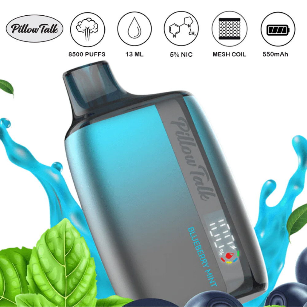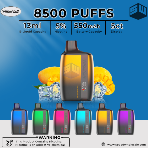 Pillow Talk 8500 Disposable, offering a 13mL prefilled capacity, 5% nicotine strength, and delivers 8500 puffs with wireless charging capabilities.
