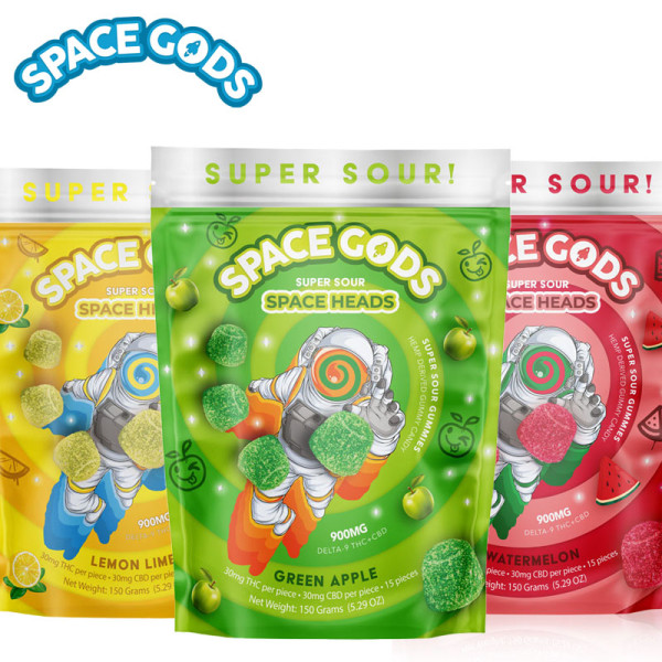 Super Sour Space Head Gummies, offering 30mg of delta 9 THC and 30mg of CBD in